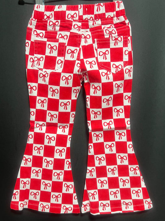 Red Bow Print Plaid Flared Jeans
